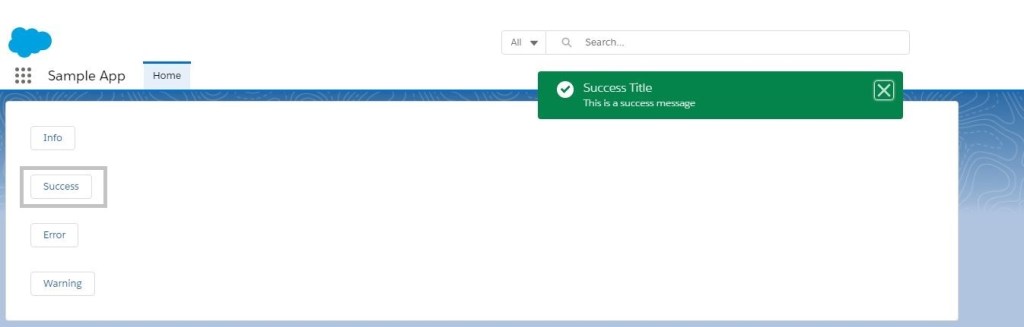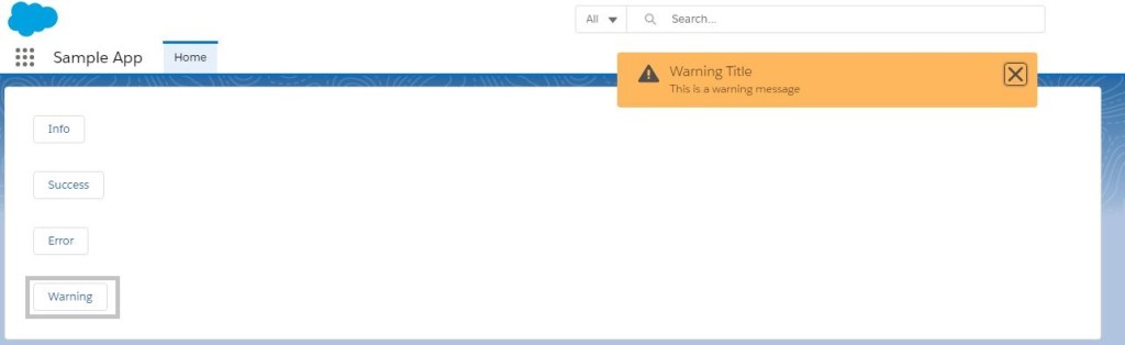 In this blog we will see all 3 ways in which we can display a toast message. A toast can also simply provide information. To display a toast notification in Lightning Experience or Lightning communities, import ShowToastEvent from the lightning/platformShowToastEvent module.